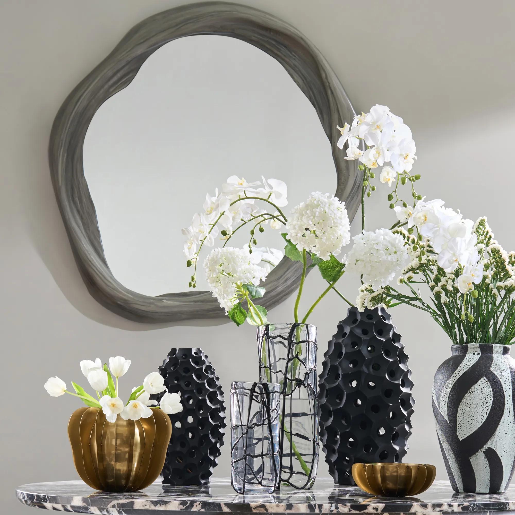 Blend high-shine metals with matte textures for contrast, and anchor your composition with books, decorative bowls, or a low tray. The result: a collected, anything-but-ordinary look that reads designer.
