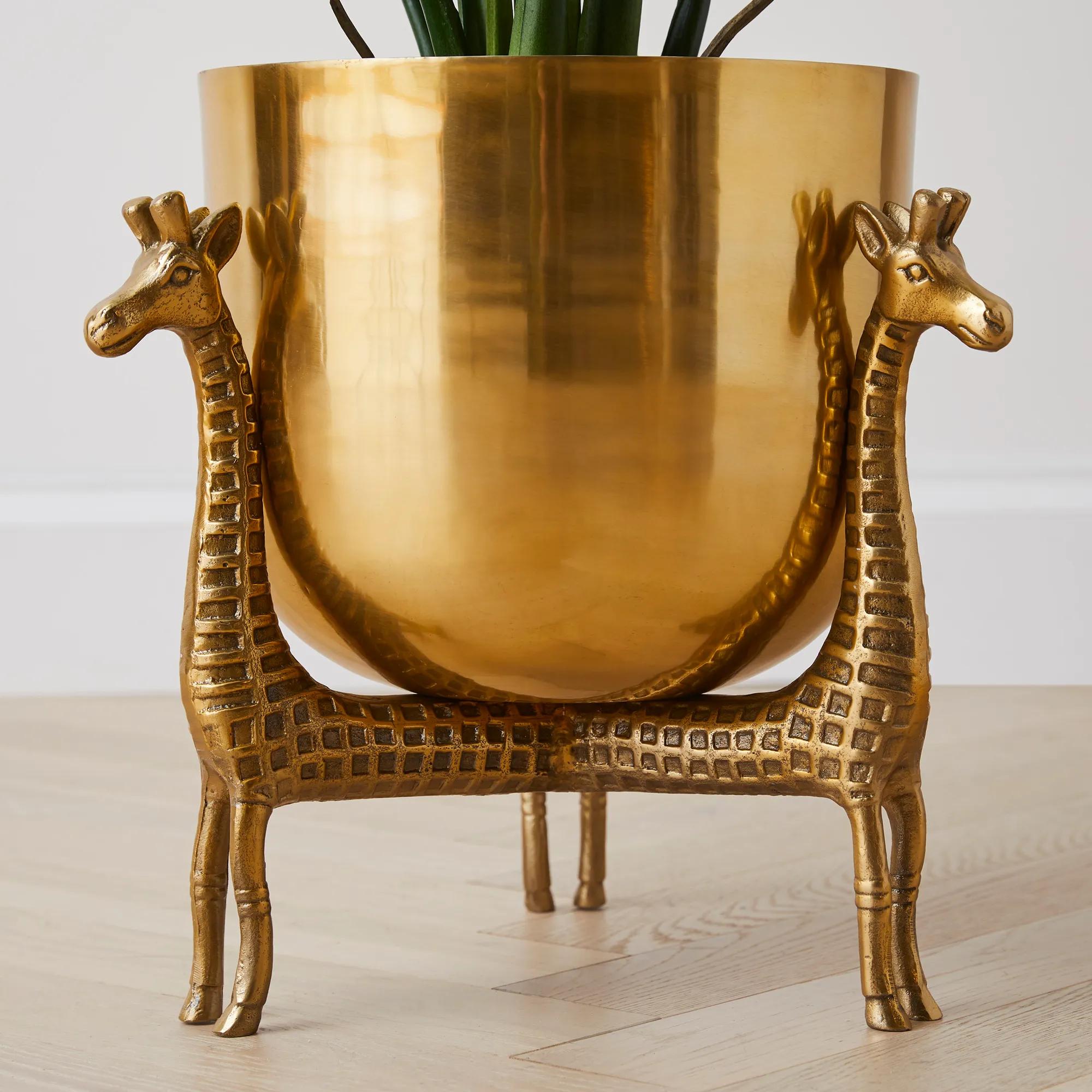 Ideal for bringing a whimsical, safari-style to your space. This planter is perched on a trio of giraffes and finished in gleaming gold.